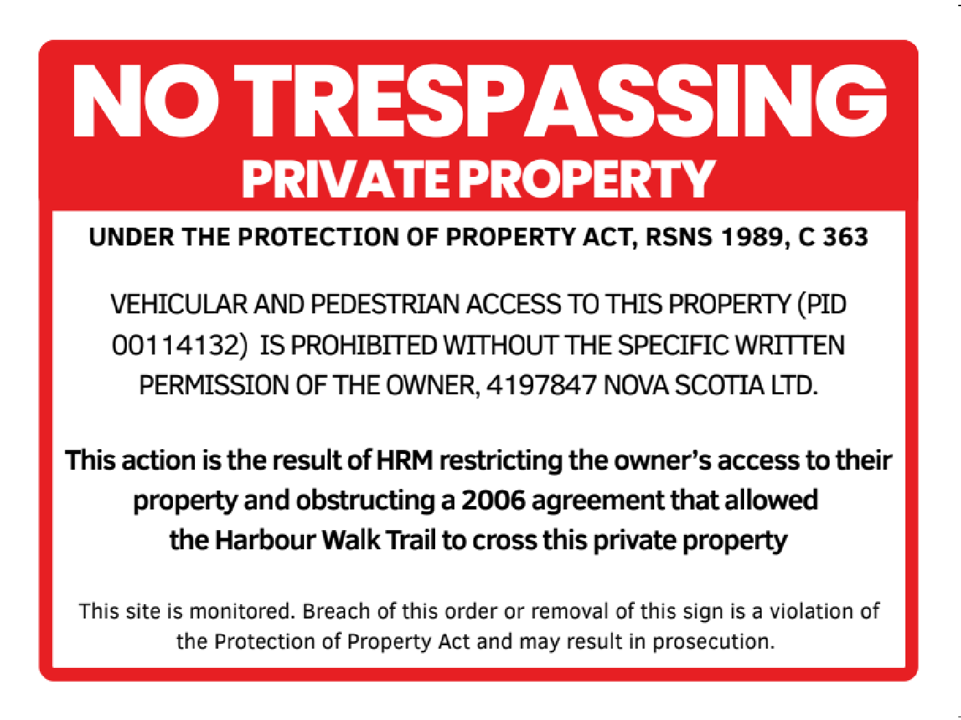 The signs say the private property notice is the result of the Halifax Regional Municipality (HRM) “restricting the owner’s access to their property and obstructing a 2006 agreement that allowed the Harbour Walk Trail to cross their private property.”